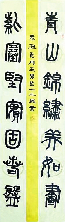 王昊哲写的这副小篆对联作品己对篆体笔法有了一定的掌握,直笔平稳有力,曲画在承接中藏而不露,这是写好篆书的基本功,把握得很好。建议在笔画的质量上加以研习,作品缺乏弹性,提按动作,用笔中的绞转应用一定注意。