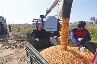 10月21日,清徐县徐沟镇丰润村,收割机在积水中收割玉米。灾情过后,清徐县积极联系农机设备,抢收秋季作物,减少农民损失。 记 者 韩双喜 牛晨阳 摄