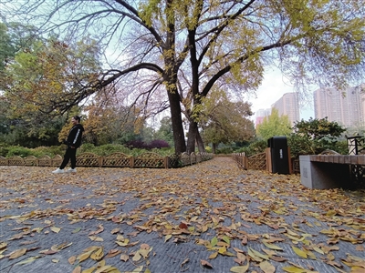 下午4时,牡丹园里,一名保洁员正在清扫小道,唯独对白蜡树周围的落叶不去触碰。原来,这是公园特意要将这些落叶多保留一段时间,目的是满足游客欣赏秋景的愿望。从10月上旬起,这些白蜡树就开始飘落变黄的树叶,画画的、拍照的、拍视频的,来了一拨,又走了一拨。