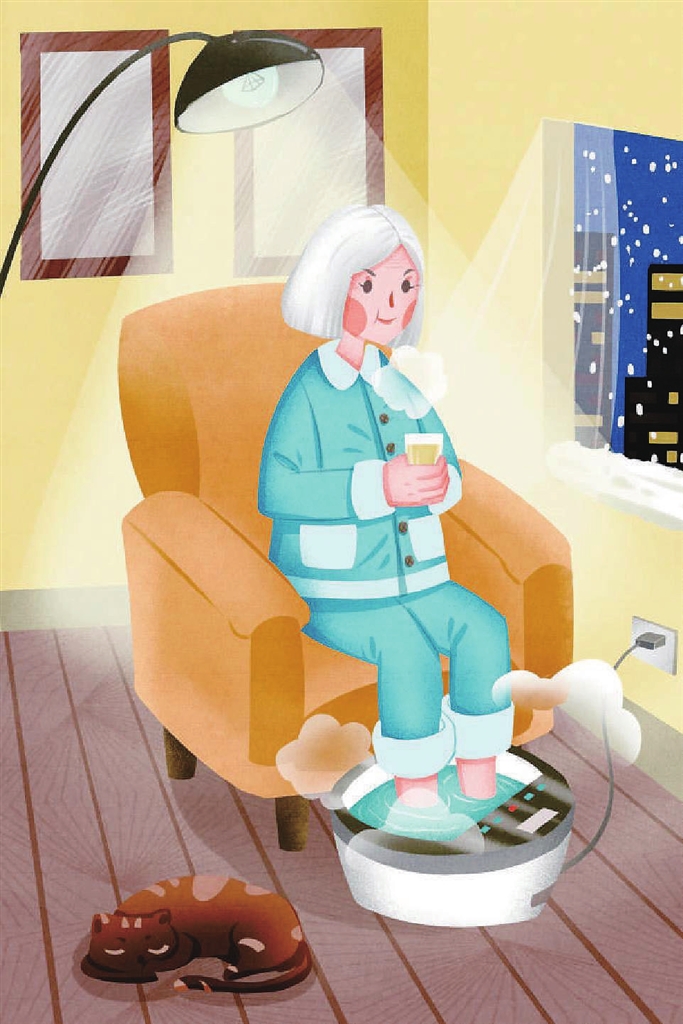 睡前泡脚有益于心血管患者,水温宜在37℃~39℃,时间在20分钟左右,水中可加入艾叶、红花、生姜等药材,温阳活血通络。睡前泡脚能扩张人体外周血管,增加排汗量,血压下降,尿量增多,心率轻微加快,可使人体血液再分配,缓解肌肉痉挛,增强胃肠功能,提高免疫功能,消除疲劳。