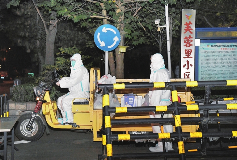 10月24日,北京市海淀区海淀街道芙蓉里社区(西区)一居民确诊为新冠肺炎病例,当日该病例居住的小区正式实行封控管理。据了解,为保障封闭小区居民日常生活,由街道工作人员、志愿者等组成的居家观察服务保障队每天轮流排班,24小时为芙蓉里社区(西区)居民提供生活服务。针对居民生活物资购置配送问题,街道为封闭小区内每栋楼建立了微信群,居民在群里发需求单,由工作人员运送生活物资。 新华社 发