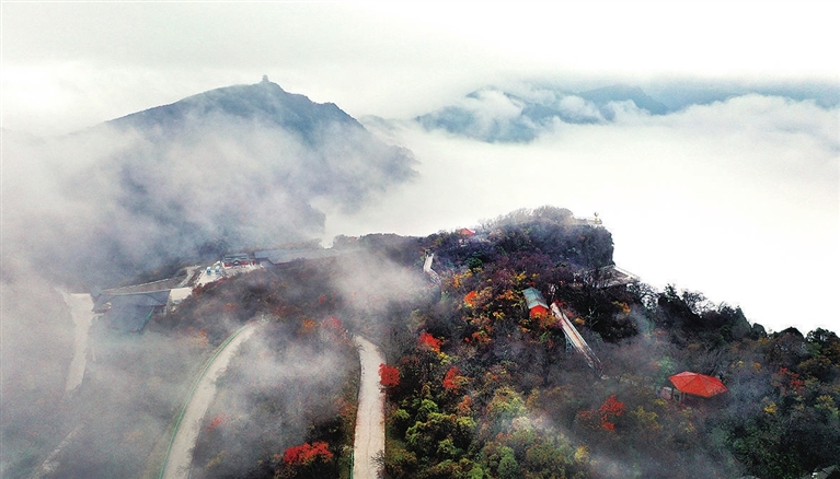 近日,位于川陕交界的陕西省汉中市南郑区龙头山旅游景区云雾缭绕,层林尽染,如火似霞的红叶点缀着连绵起伏的山峦,构成了一幅迷人的山水画卷。 新华社 发