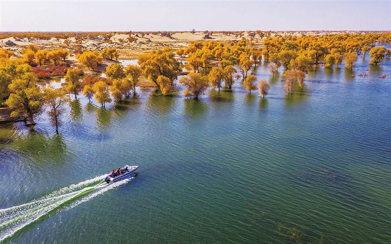 10月底,位于新疆巴音郭楞蒙古自治州尉犁县境内的罗布淖尔国家湿地公园已被胡杨染成一片金黄。2021年8月2日,新疆启动第22次向我国最长内陆河——塔里木河生态输水。随着塔里木河综合治理的不断推进,两岸绿色走廊生态环境持续得到修复。地处流域内的罗布淖尔国家湿地公园水域面积也由先前不足3000亩增长到目前的近20000亩,植被日渐繁盛,湿地公园也成为了众多鸟类的栖息地。新华社 发