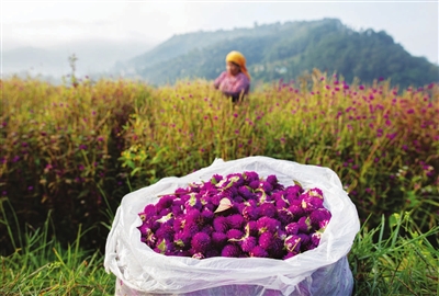 10月28日,一名女子在尼泊尔巴克塔普尔采摘千日红,迎接排灯节。