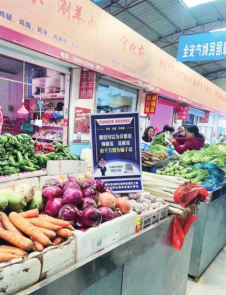 涧河街道相关负责人表示,街道将辖区人流量最大的菜市场打造成反诈宣传主阵地,营造了全民反诈的浓厚氛围,取得了良好的宣传效果,让身边的“菜篮子”守好居民的“钱袋子”。