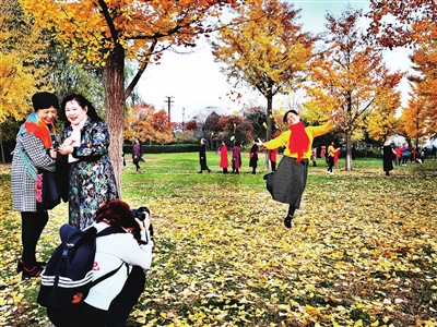 秋天是堂课,迟早得补上。原以为今年秋天已匆匆而过,未料近日她又姗姗而来。10月31日,休息日,胜利桥西街心花园满地金黄,银杏落叶甚为壮观,休息的人们纷纷走出家门,三三两两结伴而来,徜徉在银杏叶的“海洋”中,来回走几步,摆几个造型,再用手机留住这深秋的美景,让人放松,使人陶醉。 李晓琳 摄
