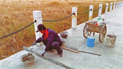 11月3日,汾河景区新建成的步道上,工人正在切割道路伸缩缝,防止入冬后,路面因热胀冷缩而产生裂缝。 徐浩轩 摄