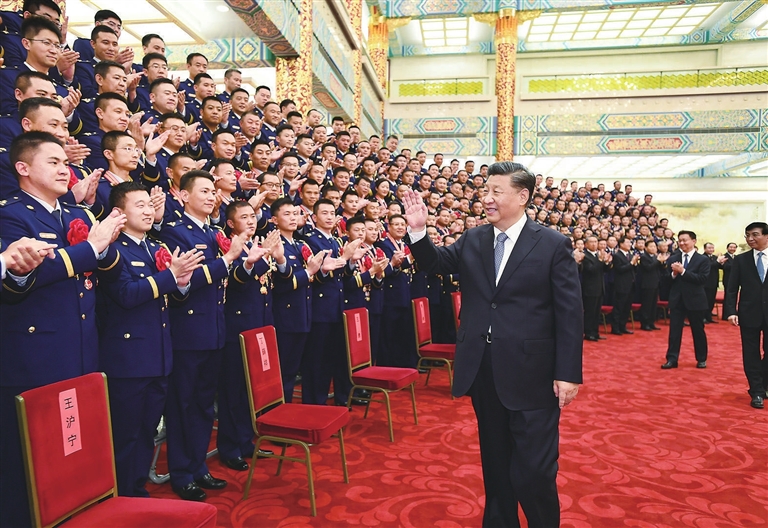 11月5日,党和国家领导人习近平、王沪宁、韩正等在北京人民大会堂会见全国应急管理系统先进模范和消防忠诚卫士表彰大会代表。 新华社 发