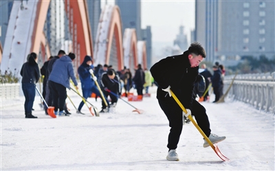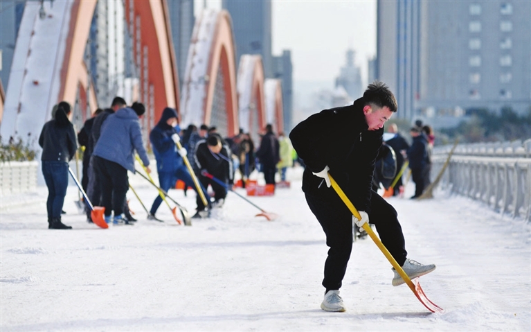 11月7日7时许,漪汾桥上,山西诚信市政建设有限公司组织员工清理道路积雪。当日,市政、城管等部门组织志愿者在全市主要路段进行清雪作业,保障道路畅通,让市民平安出行。牛晨阳 摄