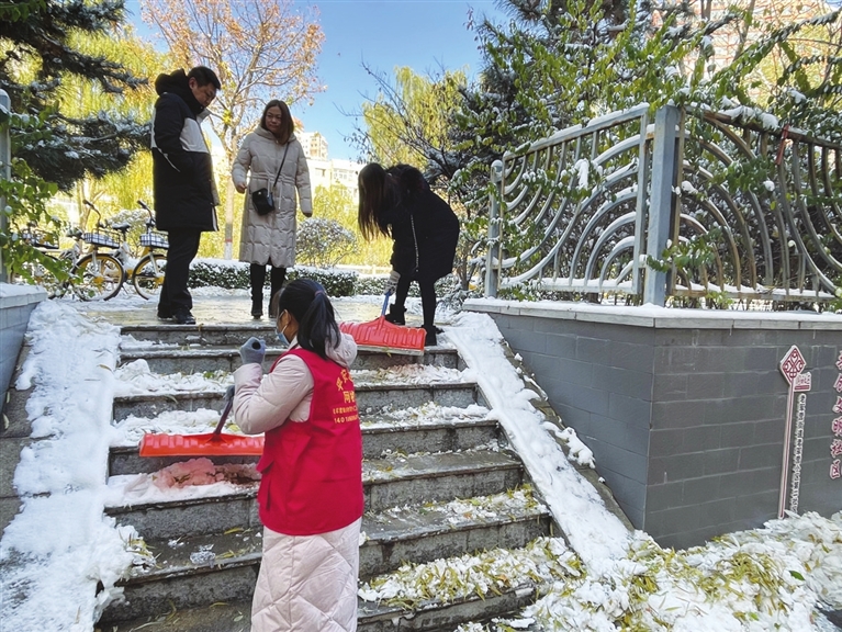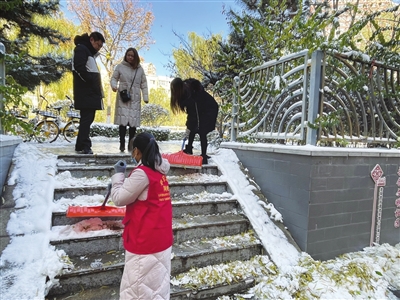 11月6日晚上的这场大雪,给我市增添了美丽的景致,也为居民出行带来安全隐患。当天一大早,社区工作人员便整齐集结在社区,穿上红马甲,带着铁锹、扫帚等工具分头前往主干道和居民区。