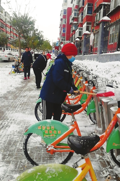 据介绍,当天上午,太原公交公共自行车公司的管理员全部出动,清扫“公车点”内以及周边便道上的积雪。在12时前,主干道旁的“公车点”的积雪已基本清理干净。