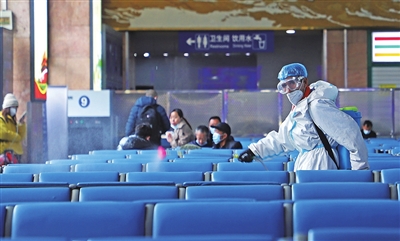 11月7日,太原火车站候车大厅,工作人员对出入口、安检口、卫生间等设施全面消杀,确保旅客安全出行,筑牢“防疫墙”。 张昊宇 摄
