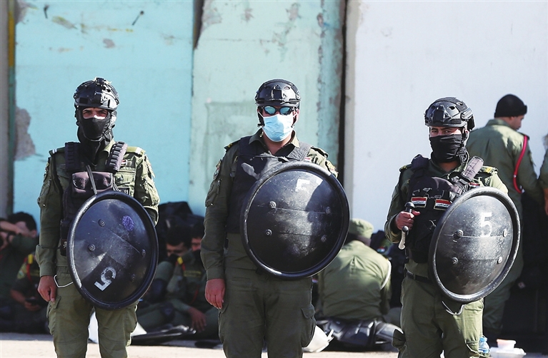 11月7日,防暴警察在伊拉克巴格达“绿区”附近警戒。