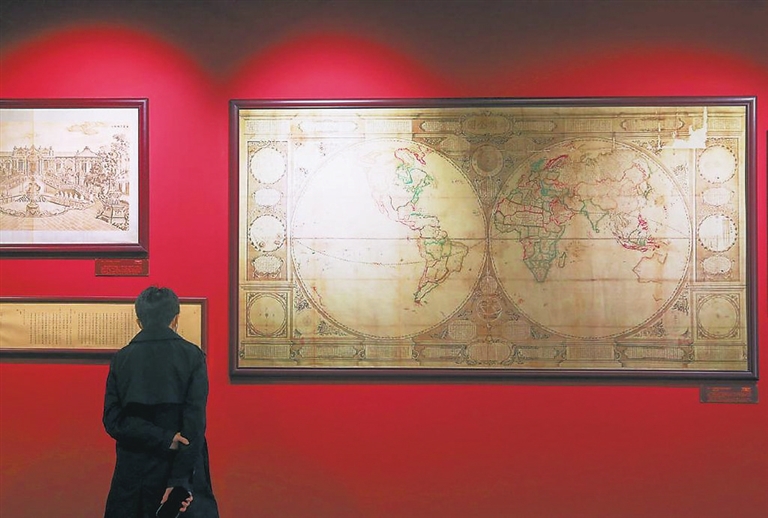 清代皇帝与传教士的互动颇多。展厅里,一幅绢本彩绘《坤舆全图》则是法国传教士蒋友仁绘制,进呈给乾隆帝的。这张地图中,采用秋装投影法画出了除南极洲之外的所有大洲,对中国的疆域进行了非常细致的描绘和标注,除东西两半球图外,四周绘有十余幅天文图。这是中国当时最新、最全的世界地图,蒋友仁为中国人带来了哥白尼的日心说,介绍了开普勒三大定律以及欧洲天文学的一些最新进展。这张图涵盖了16世纪至18世纪中叶,东西方地理和天文学方面最新成果。