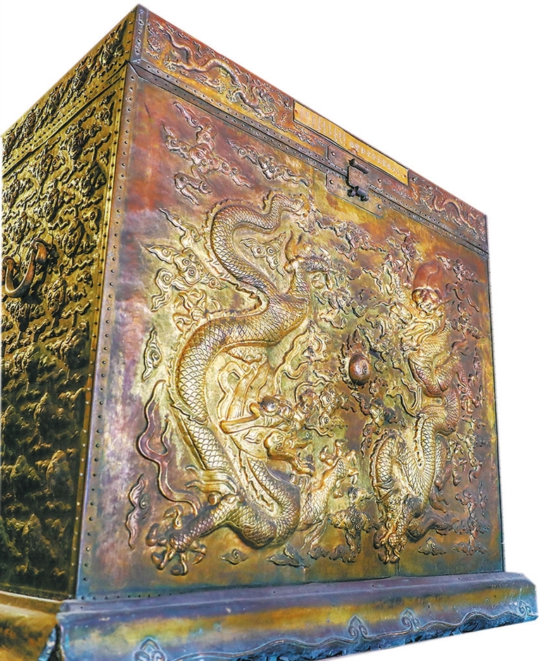 理解了金匮保存皇家档案的内涵,再观看这些金匮,其表面錾刻着精美的云龙纹,仔细看,每个金匮上的祥龙造型各不相同,这是因为每个金匮来自明清不同朝代。工作人员说,正是每个朝代审美特点、铸造技术各不相同,让今天的我们得以见到这些独具特色的精美纹饰。据记载,明朝制造金匮19座,清承明制,继续制造金匮,中国第一历史档案馆现藏金匮152座,参照乾隆朝《皇史宬全图》中的金匮数量,将其中32座保存在皇史宬正殿,其余迁入该馆新馆。