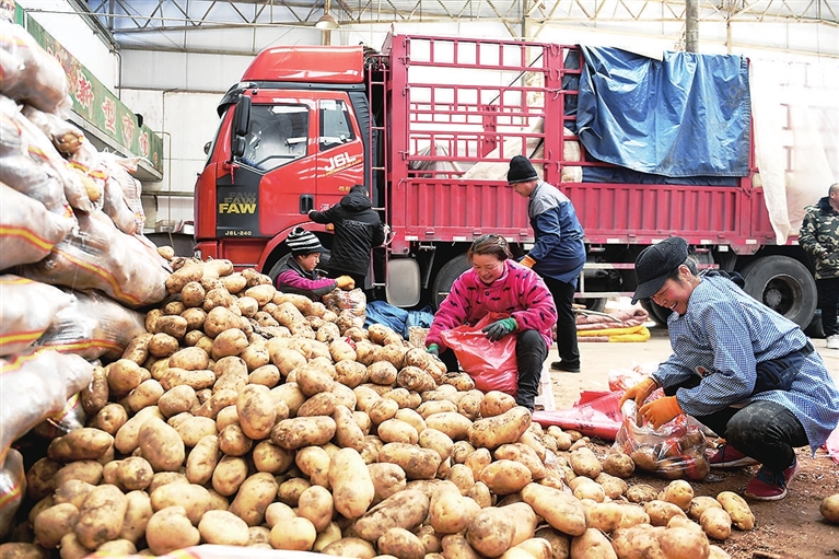 11月9日,太原市河西农产品批发市场内,今冬首批6000余吨保障蔬菜正在卸车。为了应对寒流,保障冬季蔬菜供应充足,河西农产品批发市场从全国各地组织货源,调运白菜、土豆、胡萝卜、洋葱等农产品,确保市民“菜篮子”充足。 记者 米国伟 摄