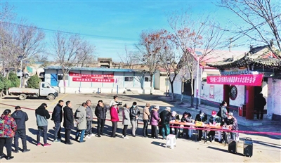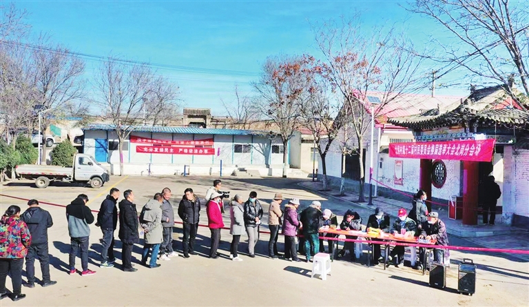 11月10日,阳曲县北留村第十二届村民委员会换届选举大会北岗分会场上,村民排着队领取选票。近期,我市第十二届村民委员会换届选举有序稳步推进。 记者 韩双喜 摄