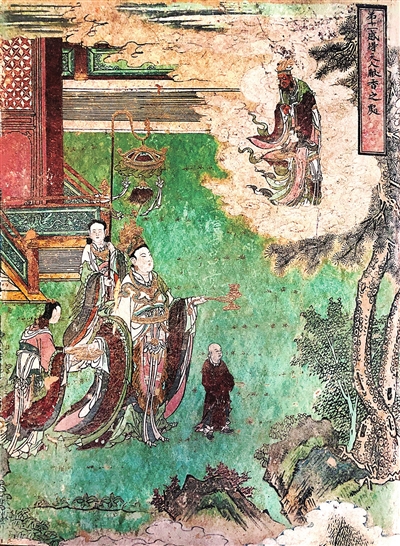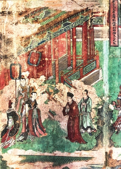 走进殿内,光线有些昏暗,却难掩壁画的光彩。壁画依画题由东壁南端开始,逆时针方向布列,上下两层,上列奇数,下列偶数。色彩以青绿为主,兼用朱、黄、赭、白等色,重点之处以沥粉贴金渲染。细看画面人物、建筑以及自然景观,布局得当,设色和融,疏密相间,错落有致。各幅画之间用树木、榜题、建筑、云气和色线相隔相连。壁画主题鲜明,区分自然,相互呼应,浑然一体,恢弘气势扑面而来。