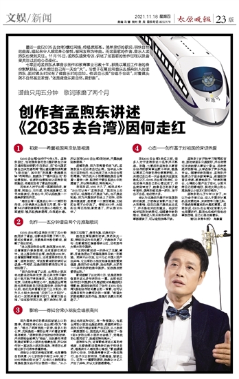 《2035去台湾》创作于今年3月。孟煦东回忆,当时国务院印发《国家综合立体交通网规划纲要》引发热议,在“优化国家综合立体交通布局”部分提到要加快构建“6条主轴”,其中的“京津冀-粤港澳主轴”布局部分,就提及了“福州至台北”的远景规划。这样的远景规划让孟煦东很受触动,有感而发有了歌曲的创意。