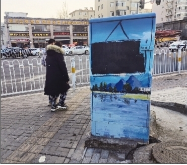 这是记者11月18日拍到的图片。在太榆路学府街交叉口西北角,一台“长相”普通的通信柜,经社区志愿者精心打扮,为之“穿”上美丽的山水画“外衣”,变得美丽起来。但是,这件“衣服”刚穿一年多,有人居然在柜子漂亮的“外衣”上涂了一块黑色。如此行为太丑陋。 申波 摄