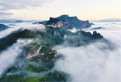 立冬以来,武夷山国家公园内依旧群山青翠,枫红杏黄,云雾缭绕的清晨更是美景如画,吸引游客登高观赏日出。 新华社 发