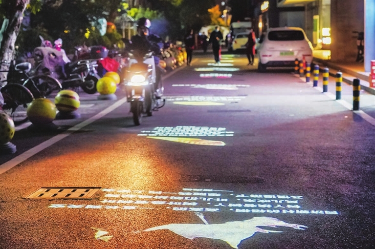 在上海市杨浦区四平路1028弄,由于不属于市政干道,这里有一条没有路名也没有路灯的道路。今年10月,作为2021上海城市空间艺术季项目之一的“诗歌单行道”在四平路1028弄点亮,长短不一的诗歌通过灯光投影在地面,点亮了居民的回家路。据了解,单行道投影灯每天下午5时亮灯,熄灯时间定在凌晨1时,诗歌内容定期更换,都是由本地居民创作。 新华社 发