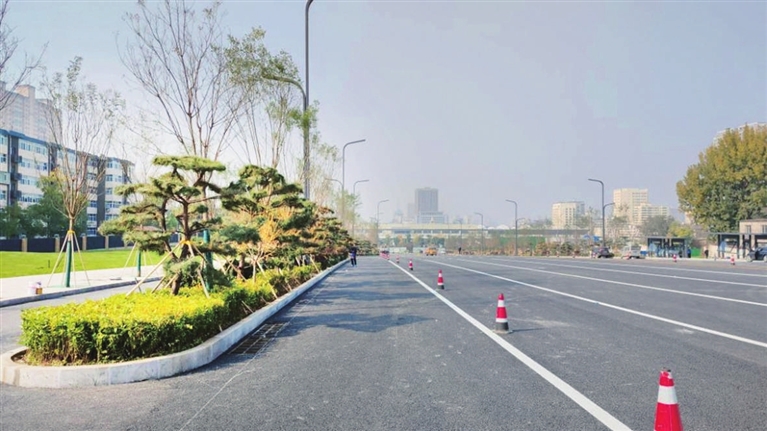 在迎泽大街东延段,记者看到,配套绿化工程主要是机非隔离带和路侧绿化带,栽植了国槐、景观油松、金叶复叶槭等乔木,金枝槐、榆叶梅等花灌木,并配有绿篱、草坪。不少树木高两三米、胸径达到10厘米以上,树冠部位的枝杈已经被修剪过,根部裹有泥土。树木被放入树穴中后,工人们会给树木填好土,并给树木设置好固定支撑架,还会给其中一些树木裹一层“防寒服”。据市道路绿化养管中心副主任陈万兴讲,现累计完成绿化面积14000多平方米,道路景观效果已初步显现。