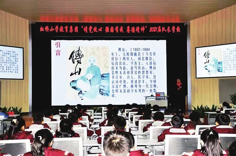 虹桥小学教育集团总校和涧河分校的大、中、小队干部,加入了2021届队长学校。活动中,中华傅山园研学部主任张万平带来“良善大爱,立志成才”专题讲座。张老师从书画、国学、医学、武术等方面带领队员们走近傅山先生。张老师引经据典、谈古论今,以故事的形式讲述傅山先生的渊博学识、良善之心、大爱之情,激励同学们要勤奋学习,力所能及做好事,为祖国建设贡献少先队员的绵薄之力。