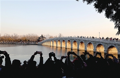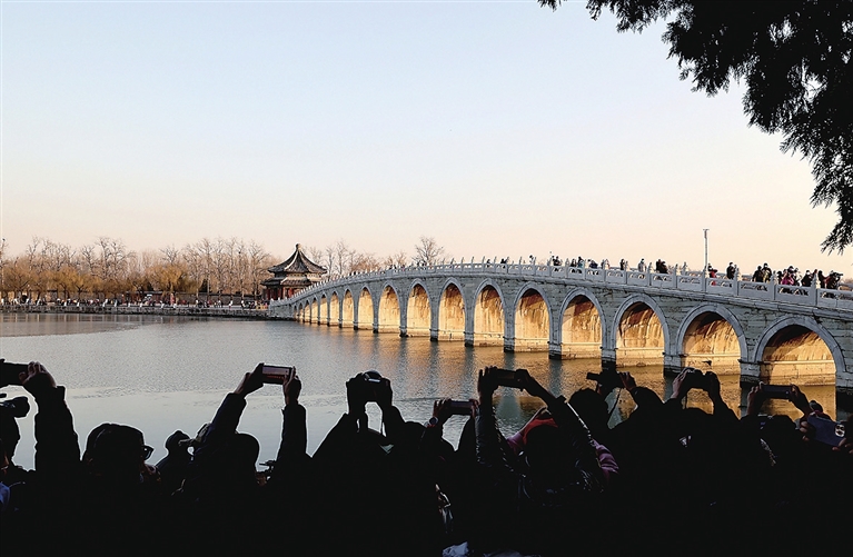 11月25日,游客在北京颐和园南湖岛拍摄“金光穿洞”。