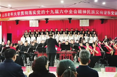 11月26日,一场生动的民族交响音乐党课在山西老年大学唱响。这场民族交响音乐党课既是省委老干部局开展的“百年奋斗路 银龄心向党”系列活动第三场演出,也是该局学习贯彻党的十九届六中全会精神的具体举措。 李晓琳 摄