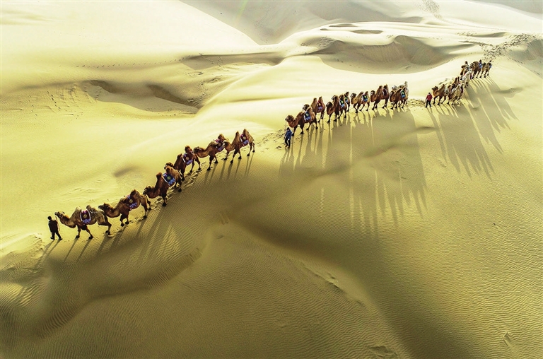 冬日,位于内蒙古自治区鄂尔多斯市的库布其沙漠壮美而静谧,驼队行走其中,构成一幅沙海画卷。新华社 发
