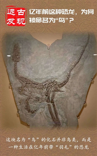“这块中华龙鸟化石最初发现时,曾被专家认为是原始的鸟类而得名。”辽宁省朝阳市文化研究学者雷广臻说,1996年,全身披覆着原始绒毛的中华龙鸟化石发现于朝阳北票市四合屯村。后来,这块化石辗转到了时任中国地质博物馆馆长季强的手中。季强和他的同事分析了化石上的“原始羽毛”及化石似鸟类的特点,将其命名为“中华龙鸟”。这一发现和命名很快轰动了古生物界。