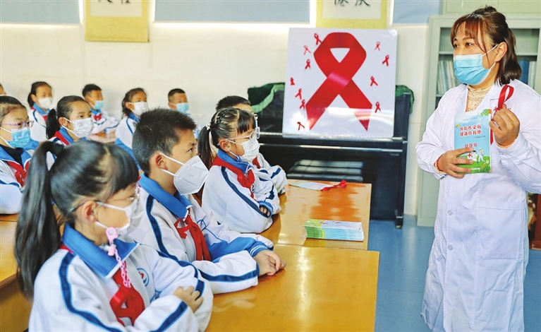 11月30日,河北省秦皇岛市海港区疾病预防控制中心工作人员为交建里小学学生讲解预防艾滋病相关知识。 12月1日是世界艾滋病日,各地举办预防艾滋病宣传教育活动,提高人们对艾滋病的危害、传播途径和预防等方面的认知和了解。 新华社 发