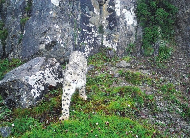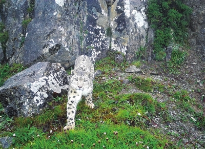 这是在绵阳市平武县王朗国家级自然保护区内红外相机拍摄到的雪豹影像(2021年8月19日摄)。