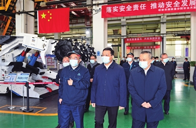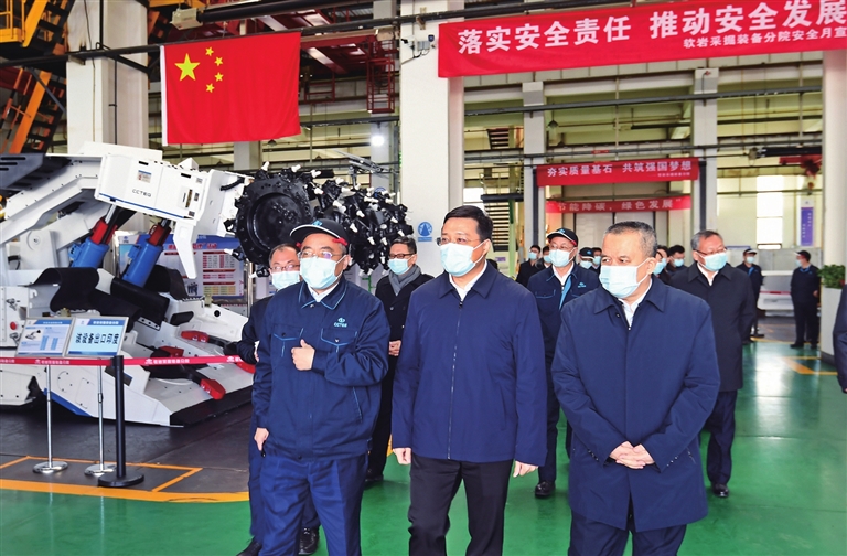 山西天地煤机装备有限公司主要从事煤矿开采、掘进、运输、支护技术与装备的研究和开发,是国内煤矿机械装备领军企业。韦韬先后来到软岩采掘、防爆车辆、掘进装备分院,实地察看掘锚一体机、防爆无轨胶轮车、连续采煤机等先进煤机装备展示,了解核心技术、产品性能、市场销售等情况,希望企业立足山西煤炭资源优势,抢抓煤矿智能化改造契机,依托强大的研发生产能力,集聚配套企业,延伸产业链条,在煤炭智能绿色安全开采领域占据更大市场份额。