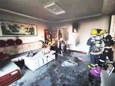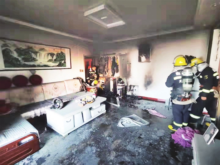 12月2日上午9时许,龙堡街怡然家园2号楼,一住户家中突然出现猛烈火情,室内人员迅速报警求助。接到报警后,消防救援人员以最快的速度赶到,确定火场内的两名被困者已安全撤离。经确认,燃烧点在家门口,燃烧物是一辆正在充电的电动自行车。室内温度很高,近20平方米的客厅内,挂在房门附近的衣服等被烧毁,地面被烧得发黑,墙面被熏得黑漆漆的,沙发上落满黑灰。经过几分钟处置,现场火情被扑灭,一辆被烧得只剩金属框架的电动自行车被转移至楼道内。