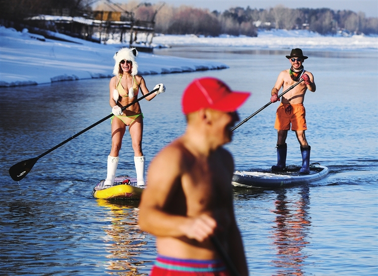 12月1日,站立划水板爱好者在俄罗斯新西伯利亚的鄂毕河上参加“我是西伯利亚人”活动,推广健康的生活方式和冬日休闲项目。