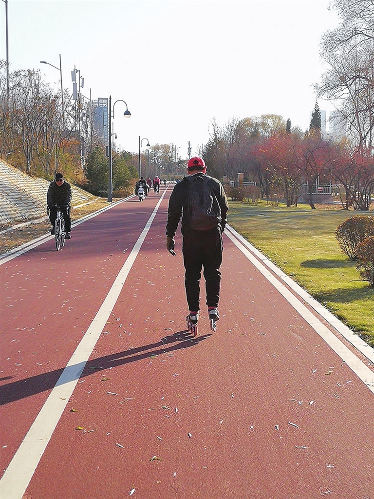 12月6日下午3时许,一个小伙子脚踏轮滑在汾河景区河东自行车道行进。对于自行车道,汾河景区有明确规定,禁止轮滑、宠物等进入。 记者 司勇 摄