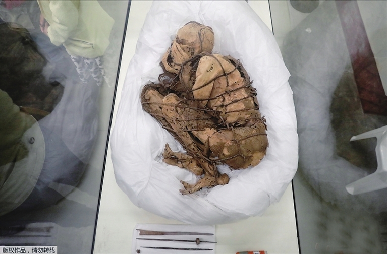 12月8日消息,秘鲁考古学家在首都利马附近的一处遗址发现了一具估计有800至1200年历史的木乃伊,该木乃伊保存完好,用绳子绑起来并用手蒙住脸。 中新社供图