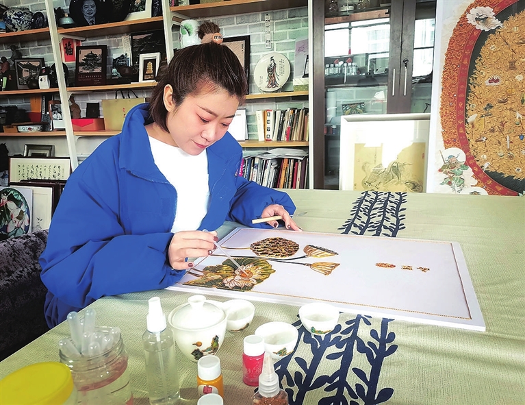 “获奖欣喜之余,我感觉自己有这份自信。”庄秋燕口中的自信源于努力加天分。她非美术专业科班出身,但生在艺术世家,从外曾祖母开始,到奶奶、爸爸,皆从事与美术相关的工作,34岁的她算“浸”在艺术环境里长大。真正系统学习珐琅画技艺是2009年,12年磨砺,技艺飞涨同时,以传统技法结合当代审美,并广泛用于书签、摆盘、茶台等生活用具,还与行业大师的瓷器、葫芦等结合,进行二次创作,碰撞“国潮”火花,让金丝珐琅画技艺融入现代生活,得到了更好的发展与传承。