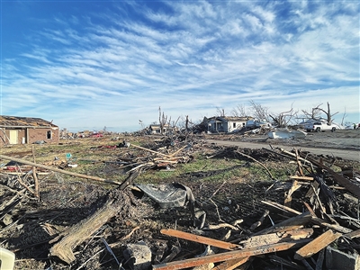 上传至社交媒体的视频和照片显示,肯塔基州梅菲尔德镇中心的砖砌建筑物被夷为平地,停放的汽车几乎被瓦砾掩埋,格雷夫斯县法院建筑尖顶倒塌,附近一座教堂部分坍塌。