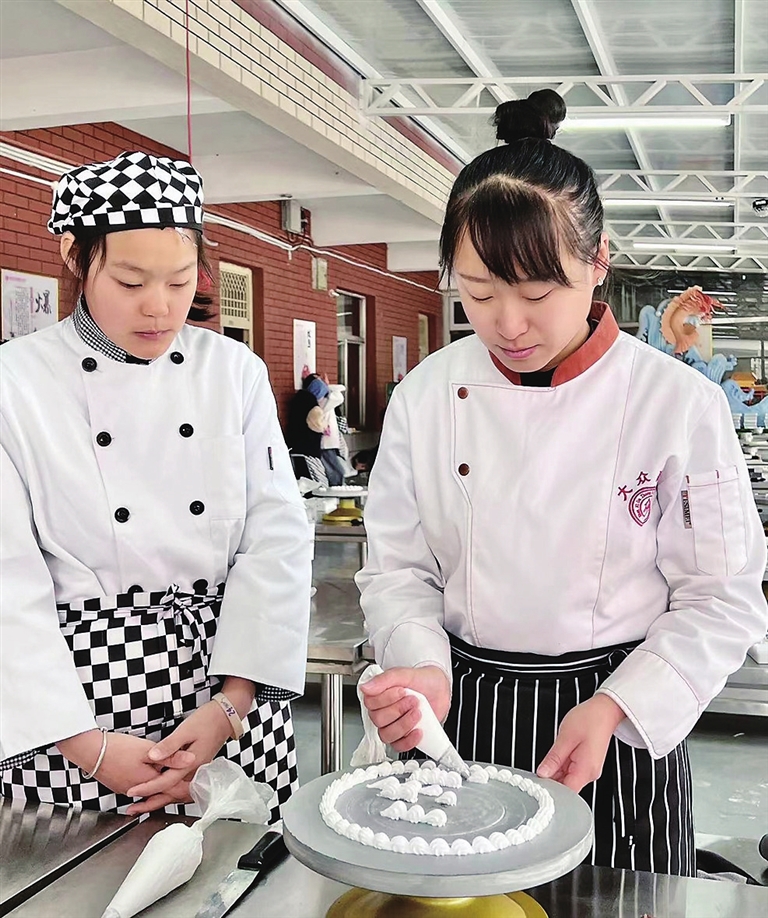 这是山西大众高级技工学校的校园。杨雪娇刚刚下课,身旁的西点烘焙实训室里,几十名学生还沉浸在课程中,对着面前台案上新裱的奶油花边叽叽喳喳,杨老师今天的授课内容很新鲜。