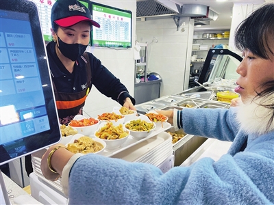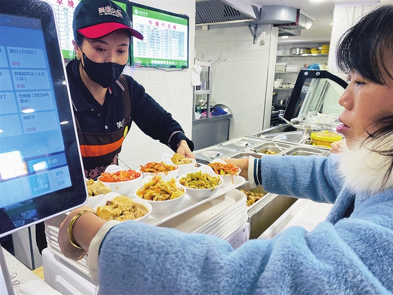 11时40分,在附近上学的刘佳欣放学后和妈妈走进了社区食堂。冬瓜排骨、过油肉、鱼香肉丝、豆芽粉丝……看着琳琅满目的各式菜品,孩子犯起了“选择困难症”,“看着哪样菜都好吃,我都想尝尝。”最终母女二人选择了两份米、面套餐。“这8元的套餐里就有一荤一素、一份凉菜、一碗汤、一份主食,两份套餐才16元,我们都吃得饱饱的,而且味道很不错。”刘佳欣的妈妈对记者说。