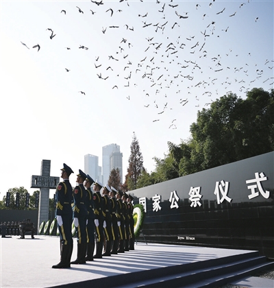 这是十二月十三日拍摄的南京大屠杀死难者国家公祭仪式现场。 当日是第八个南京大屠杀死难者国家公祭日,南京大屠杀死难者国家公祭仪式在侵华日军南京大屠杀遇难同胞纪念馆举行。 新华社 发