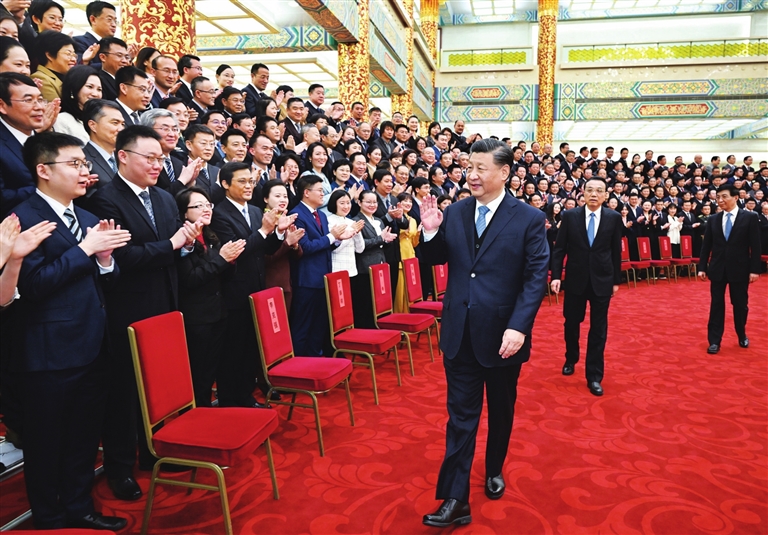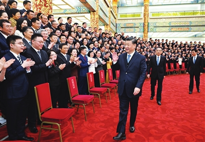 下午3时10分,习近平等来到人民大会堂金色大厅,全场响起热烈掌声。习近平等走到代表们中间,同大家亲切交流并合影留念。