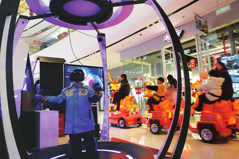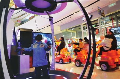 12月14日,解放路一家商场内,孩子们正在体验VR游戏。随着新技术广泛应用,越来越多体感游戏深入生活,让更多人体验到科技的魅力。 张昊宇 摄