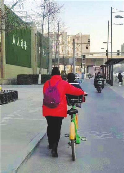 12月14日下午4时许,二车队管理员张师傅途经建设南路朝阳街口附近时,看到一名女士推着一辆公共自行车走在非机动车道上,一名戴着红领巾的小男孩正坐在后护板上。张师傅赶紧上前制止,推着车子的女士才极不情愿地让孩子跳下了车。