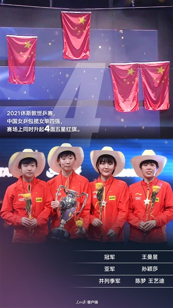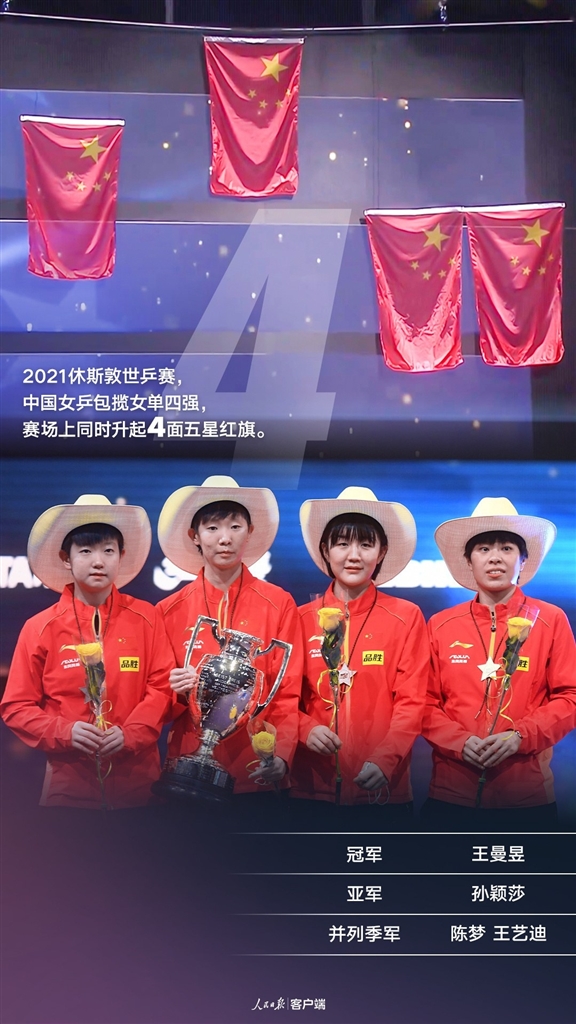 | 2021休斯敦世乒赛,中国女乒包揽女单四强,赛场上同时升起4面五星红旗。 |