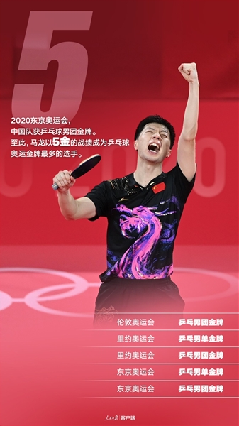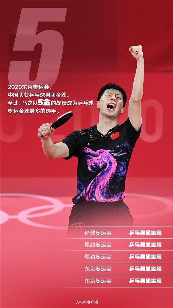 | 2020东京奥运会,中国队获得乒乓球男团金牌。至此,马龙以奥运会5金的战绩成为在奥运会乒乓球项目中,获得金牌最多的运动员。 |