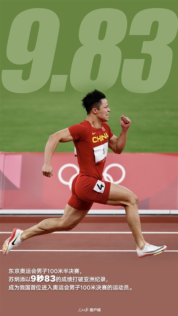 | 东京奥运会男子100米半决赛,孙炳添以9秒83的成绩打破亚洲纪录,成为我国首位进入奥运会男子100米决赛的运动员。 |